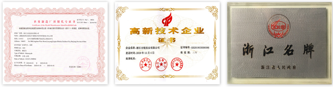 公司“吉铭牌”摩托车被授予“中国名牌”、“中国绿色产品”、“浙江名牌产品”、“浙江著名商标”等多种荣誉。公司现主要以出口为主,出口国家包括美国、欧洲、东南亚等国,公司是浙江省科技型企业,“中国制造网认证供应商”、“台州市进出口协会副会长单位”、“台州市进出口诚信企业A级企业”,拥有一批经验丰富、业务能力强的行政管理、技术、开发、生产、外贸人员。公司拥有各类中高级人才,其中大中专以上文化程度占70%,平时通过师傅带徒弟、岗位技能鉴定、技术大比武和鼓励创新活动,打造了一支勇于创新、敢担重任、纪律严明、技术过硬的职工队伍。平时公司十分重视人才工作,劳动关系和谐,被评为路桥区2017年度人才工作优秀企业、和谐劳动关系优秀企业、台州市工人先锋号、路桥区先进班组等。